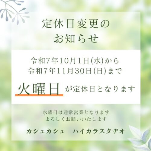 この度カシュカシュ及びハイカラスタヂオでは、秋シーズンの定休日を変更させていただくことになりました。
